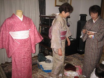 今日は着つけ教室の日。 着せ方(自分が着るのではなく、着せてあげる着つけ)を習って4・5回目なのに 納得のいく着せ方は、なかなか出来ない。 先生がコツを丁寧に教えて下さるのだが、注意事項が多すぎて、記憶力の衰えた頭に インプットするには時間がかかるみたいだ。 (笑) 15分で着せられるのが目標だ。 まだまだ習得するのには時間が掛かりそうだ。 前回の時は私とT田さんでお互いに着せ合う方法で、着せ方を習ったのだが、 今日はT田さんとT見さんが着せ合って、私はマネキンに着つけをした。 20代の時に作ったピンク色の紬の着物と母の紫の帯で着つけを習った。 体格の良い人、痩せている人、いかり肩の人、胸が大きい人と色々な体型に合わせて 補正をしてから着つけをする。 どんな体型の人でも大丈夫! (笑)。 難しいけれど、楽しい〜 上手になって手始めに美映に着せてあげようかな〜(笑)