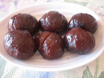 そして夕食後に取り組んだのが、栗の渋皮煮だ。 | 昔は、何回も作った事があるが、最近は手が掛かりすぎると敬遠していた。 渋皮に傷がつかないように鬼皮だけをむく作業は、神経を使う。 傷がつくと、そこから崩れてしまい、まるまるとした栗の形が残らないからだ。 いくつかは失敗したが、なんとか剥き終わって、ホッ! 2回茹でて、渋皮を落としてから砂糖を入れて甘く煮込む。 レシピは →ここ やっと終わった〜と時計を見ると、夜中の1時を過ぎていた。 あらま〜(笑) 煮汁に浸けておいたが、柔らか過ぎかなと思い、今日、半日程干してみた。 少し歯ごたえのある私好みの美味しさになったと思った。 |