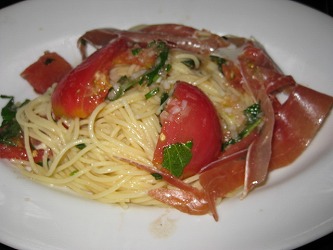 ティラミスに使うスポンジケーキの作り方から始まった。 レシピは →ここ | ポイントはメレンゲの泡立て、かなりしっかり泡立てるが、たて過ぎもダメ!。 焼きあがったスポンジを全員に味見させてくれた。 しっとり、ふっくらで美味しい〜 ティラミスは、思ったよりも簡単で、今度作ってみたいと思った。 レシピは →ここ 次に教えてもらったのは、夏にふさわしい冷製パスタと鶏肉料理。 ・栃木トマトを使った冷やしスパゲティ レシピは →ここ ・地鶏の香草、フライパン焼き、夏野菜の煮込み(カポナータ) レシピは →ここ 冷製パスタは夏にぴったりなのかも知れないが、私は熱々のスパゲティの方が好きだな〜 にんにく、ローズマリーをまぶした鶏肉をフライパンで焼いてから「カポナータ」で煮込む。 フランス料理の「ラタトーユ」と同じだが、イタリア料理では「カポナータ」と云う。 この料理も簡単で美味しいので、作ってみたいと思う。 料理教室が終わってからは、ランチタイム!