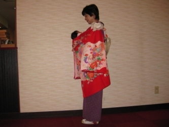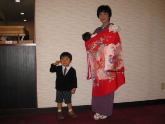 主人の高血圧騒ぎで中止になった梨子ちゃんの初宮参りに今日、行く事が出来た。 主人の体調、はなちゃんの御両親の疲れを考慮して、貞治夫婦だけで初宮参りに 行く予定だったのだが、急遽、全員でお参りする事になった。 今月初めに主人が受けたMRIの検査の結果が異常なしで、先生から今まで通りの 生活をしても良いとののお墨付きをもらって、長時間の運転も大丈夫とひと安心。 せっかくの機会なので少し早起きをして私は着物で行く事にした。 9時に千葉神社で待ち合わせの約束なので、家を6時30分に出発した。 栃木県、群馬県、埼玉県、東京、千葉と高速は渋滞もなく順調だった。 この分だったら、8時30分前に着くねと話していたら、突然渋滞が始まった。 後、37kmの地点から5kmを進むのに1時間もかかったのだ。 渋滞の訳は千葉県浦安のディズニーランドに向かう家族連れの車のせいと気が付いた。 渋滞を抜けるとスイスイと快調な運転に。。でも、20分の遅刻となってしまった。