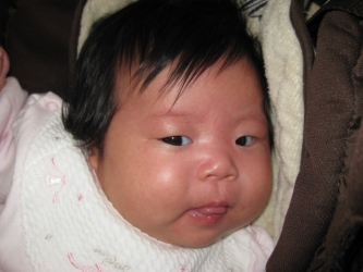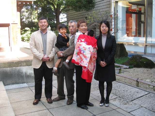 無事に終わり、外に出て記念撮影をした。 みんな、笑顔で嬉しそう〜 | 梨子ちゃんは手が掛からない赤ちゃんとの事、健康そのものみたいなので良かった〜 12月始めには上海に行ってしまうので、しばらく会えないのは寂しい。 おっぱいも沢山飲んで、ぷっくりとお顔が丸くなって女の子らしくなったね。 神社の境内では、猿回しがいて 芸を披露していた。 ジャンプしての輪くぐりと棒高跳びの2つの芸をみたが、ビデオは棒高跳びだけ。。ここ 柑太の初宮参りの時は、混雑していなかったので、境内の中の写真をいっぱい写したが 今回は、記念撮影のみの写真だけにした。