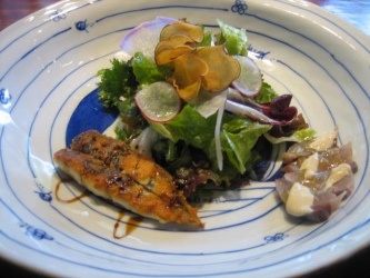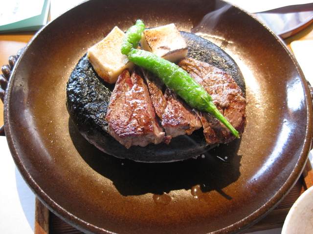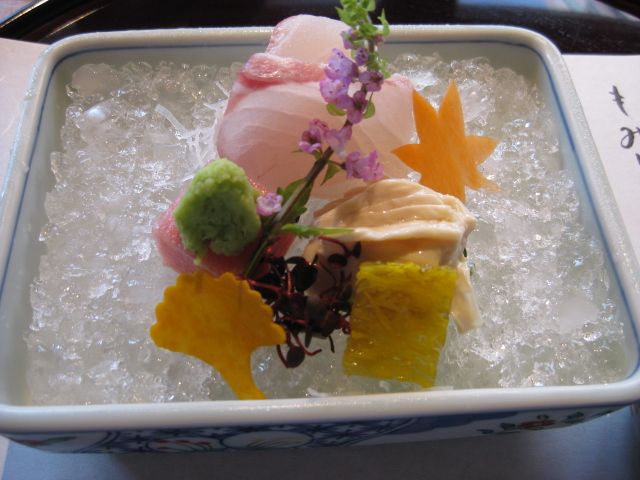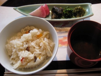 全ての料理は繊細で手をかけて作られた心のこもった料理という感じだった。 | 旬菜は牛ひれの石焼きと鰤の照り焼きのどちらかを選ぶのだが、 どうせなら両方を食べてみたいと主人と私で半分づつ食べた。 デザートも梨のシャーベットとくずきりの両方を半分づつ食べた。 吹き寄せ蟹御飯はおかわり自由だった。 昆布茶でお茶漬けにしても食べた。 着物を着ていたせいか、私は苦しいぐらいにお腹がいっぱいになった。 それで、ご飯は残して家に持って帰ってきた。(笑)