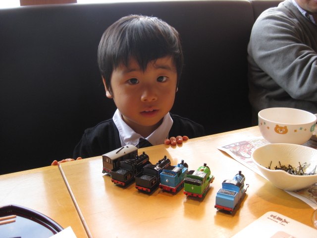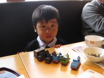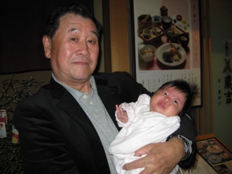 食事が終わった柑太は、持ってきた機関車トーマスの説明を主人にしていた。 | その様子をビデオに撮った。ここ そして梨子ちゃんを抱っこした主人をパチリ! 今日はお天気にも恵まれての楽しい初宮参りが出来た。 梨子ちゃんも元気ですくすくと育ってくれる事でしょう。 貞治は今日の7時台の便で上海に帰るとか。。 12月始めには家族全員揃っての上海生活が始まる。 ひとり暮らし、もう少し頑張ってね。 |