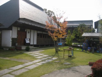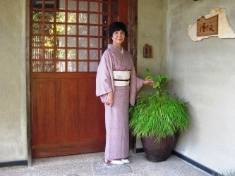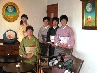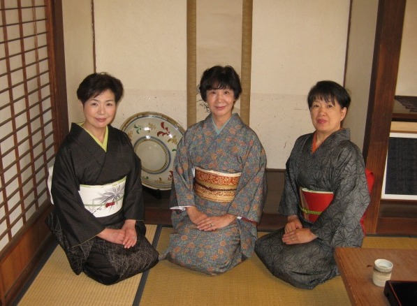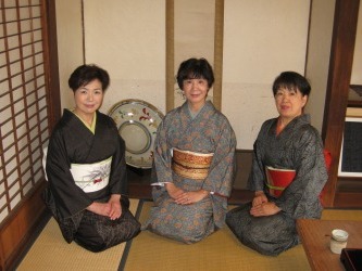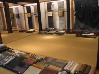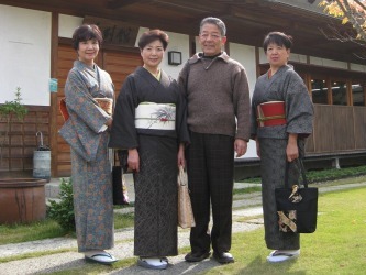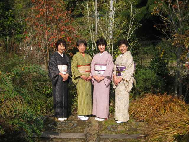 手入れされた庭で全員一緒の記念写真を、店員さんに撮ってもらった。 | その後、着物、帯、反物などの高級品を展示してある「陳列館」の建物の中に入った。 草履をぬいで室内に入ると、中は畳敷きの広々とした、昔の高級呉服屋さんのようだった。 値段を見れば、100万円以上の着物と帯がづらりと展示されていた。 私達3人は、この着物がいいね、この帯が好みだとか目の保養をさせてもらった。 資料より 150年にわたり風雪に耐えてきた重厚な古民家を結城紬の陳列場として移築しました。 長い年月に育まれた古材の美しさが結城紬にふさわしい空間を作りだしています。
