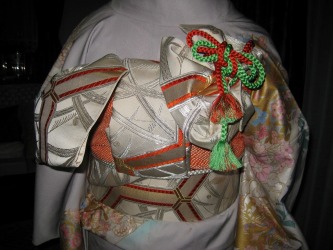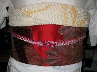 左側の文庫結びの形や右側の花の形の大きさが違ったり、花の中央から垂れる | 紐の色や形で、ちょっ違った雰囲気になる。 そして帯締めの結び方は藤結びを習った。ちょっと豪華な感じでいいな〜 習ってみると、思ったより簡単でちょっと、ホッとした。 未婚の若い女性しか結ぶ事の出来ない帯結びだけど、可愛い形なので習っていて楽しい〜