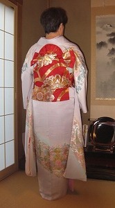 今日は、前と違う振袖の着物で練習した。 | そして帯はSさんの緑と橙色の素敵な帯を締めた。 寿結びという結婚式などに締めるおめでたい時の帯結びを習った。 写真を撮ったのだが、この年で振袖姿は、無理があるよね。 ちょっと恥ずかしい。(笑) |
