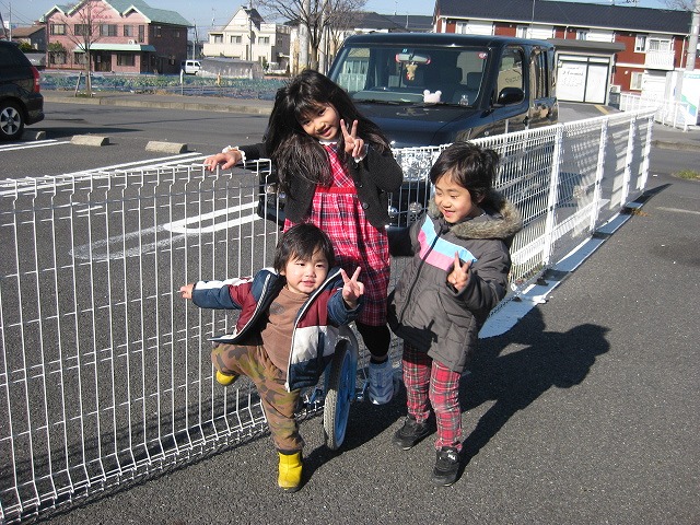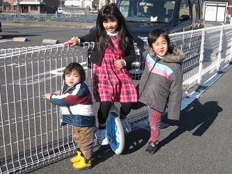 年末には、宇都宮に来ないと言っていた美映だったが、三太さんが宇都宮時代の 先輩にゴルフを誘われたとの事で、28日の仕事が終わってから、8時過ぎに 愛知を出て、29日の午前2時過ぎの夜中にやってきた。 3人の子供を連れて泊りがけの外出は、荷物も多くて大変だよね。 三太さんは、朝早くゴルフに出かけて行った。 長時間の車の運転の後、睡眠不足のままゴルフは、きついと思うけど、若さで平気かな? サンタさんにお願いし、クリスマスプレゼントにもらった一輪車。 有佳里が一輪車の練習をしたいとの事で、マンション隣の空き地に連れて行った。 まだ練習し始めたばかりの有佳里だったが、もう乗れるようになった。 そのビデオは→ここ 私は夕飯の準備があるので、主人が1日中、子供たちの面倒をみてくれた。 助かる〜