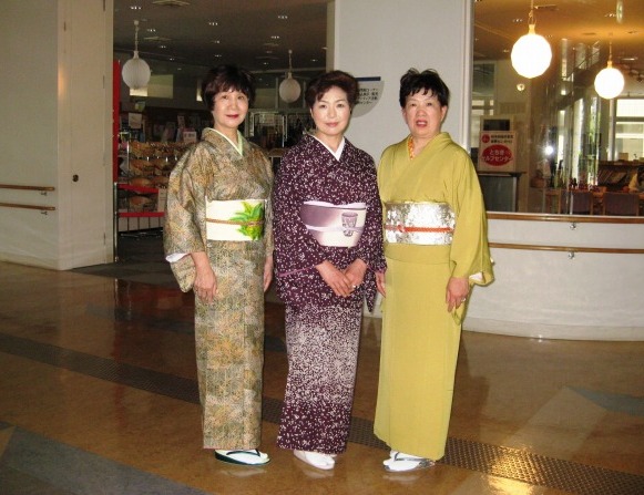 バスを降りてから「とちぎ福祉プラザ多目的ホール」まで8分位歩いた。 | 2時少し前だったので、1番、気温が高い時間帯だ。 着物で外を歩くのは、やはり暑〜い! T田さんは暑いからと洋服だった。 3人が着物姿だったので写真を撮ってもらった。