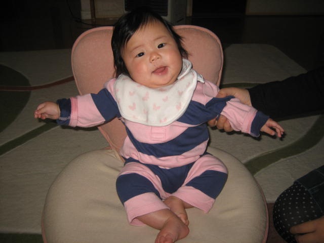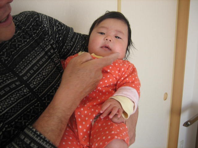 中国の春節(旧正月)のため、会社が休みになるので、貞治家族4人が上海から20日、 日本に戻ってきた。 貞治だけが、土、日と長野にスキー合宿に参加し、その間3人は 千葉のはなちゃんの実家で過ごし、今日、全員で我が家にやってきた。 しばらく振りに会った梨子ちゃんは、とっても愛想のいい笑顔の可愛い赤ちゃんになっていた。 声をかけるとニコ〜と顔をクシャクシャにして笑ってくれた。 こんな笑顔を見せた孫は始めてと、写真を撮ろうとカメラを向けると普通の笑顔に。。 カメラを向けたとたんに笑顔が少なくなる。 カメラが気になってしまうのだろうか? クシャクシャ笑顔の写真を残せなくて、ちょっぴり、残念!