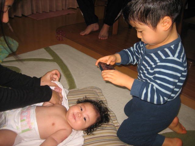 夕食後、子供2人を貞治がお風呂に入れていた。 | 〇ん〇のオムツも楽しそうに換えていて、すっかり子煩悩なパパの姿を見て、私は嬉しかった。 普段、仕事が忙しく子育ては、はなちゃんに任せきりなので、休みの時ぐらいはと思うのかな。 自分は、あまり子供の面倒を、見なかったな〜と、主人は今頃、反省していた。(笑) 梨子は、はなちゃんの母乳だけで、プリプリと太っていて可愛かったので裸の写真を撮った。 柑太も真似をして、パパの携帯でパチリと写していた。 妹が可愛くて、チュッをしたり、頬を寄せてしたりしていたが、たまに頬っぺたをつついて ビックリした梨子ちゃんが大泣きをして、困った顔をする柑太だった。