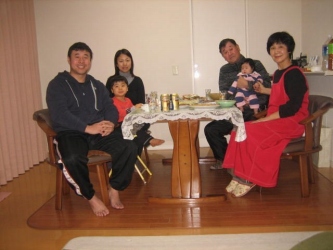 食事が終わって、大人たちがのんびりとしていると、柑太はテーブルの周りを | かけっこしていた。 元気だな〜。(笑) ビデオは →ここ |