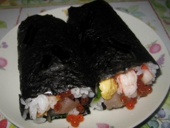 海苔巻は、しょっちゅう作るので、少しもめんどうではない。 | 今日はジムの日なので、出かける前に海老を茹で、卵焼きを作り牛蒡を薄味に煮ておいた。 寿司飯も作っておいたので、帰ってから、すぐに海苔巻を作った。 我が家は昼食に海苔巻やおにぎりを食べる事が多いので、海苔の消費量がかなり大だ。 暮れに美映が愛知の海苔を10丈、おみやげに持ってきてくれたのだが。。 いくら探しても見つからない。 美映に電話で話すと海苔の入った袋を朝大が 持って歩いているのを見たと言う。 持ち歩いた物を朝大は思いがけない場所に、しまう事ががあるらしい。 それで主人の部屋も調べ、他の部屋も、もう1度、くまなく探したのだが、やはり見つからない。 どうぞ、早く出てきますようにと祈った。 |