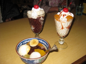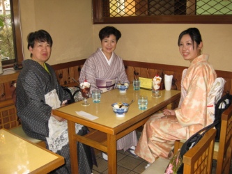 文化センターの近くの甘味処「三芳」で甘い物でも食べて帰ろうと話しがまとまった。 | 私とTさんはクリームあんみつ、Sさんは小倉パフェ、Saさんはヨーグルトパフェを注文した。 ボリューム満点で美味しかった〜♪ お値段も良心的なお店なので次から次へとお客さんが入ってきていた。 人気店なのはうなづける。 4人が着物姿で歩いていると、かなり目立つらしく、いろんな人から声をかけられた。 「きれい〜 着物はいいですね」とか「何の集まりなのですか」とか知らない人から 何回も声をかけられた。 ちょっぴり恥ずかしかったけど、嬉しくもあった。 今日はSさんの御主人が車での送迎をして下さった。 おかげさまで楽しい1日を過ごす事が出来た。 ありがとうございました。 |