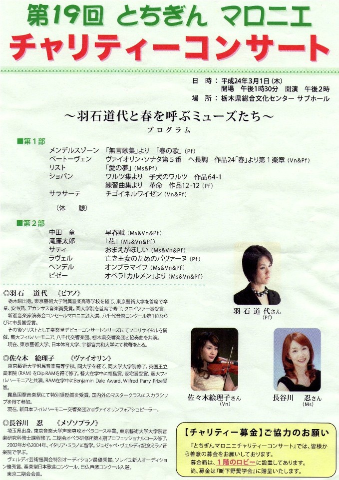 ランチの後に地元の人の工芸展が開かれていたので、見学した。 | 陶芸、竹細工、ガラス工芸など。。プロの人の作品かと思える位の大作、力作揃いだった。 2時から 「とちぎん マロニエ チャリティコンサート」が始まった。 プログラムは →ここ ピアノの羽石道代さん、ヴァイオリンの佐々木絵理子さん、メゾソプラノの長谷川忍さん。 3人の経歴を見ると素晴らしい実力者なのだと分かった。 経歴は →ここ クラシックなのだが聞いた事のある曲ばかりなので、楽しく聞く事が出来た。 圧巻だったのはオペラ「カルメン」の中の恋の歌だった。 真っ赤の衣装に着替えた長谷川忍さんの情感こもった歌声に会場のみなが酔いしれた。 「うまい!」と思わず大きな声をあげ、誉めたたえたおじさんがいた。 拍手喝さいのうちにコンサートは終了した。 やっぱり生の演奏はいいな〜と、つくづく感じた。 工芸展とチャリティコンサートの写真を撮るのは、禁止のようなので残念だった。