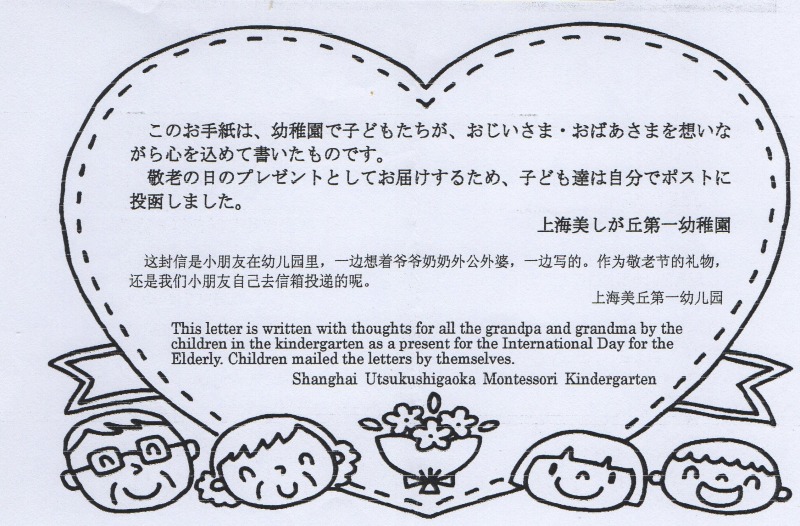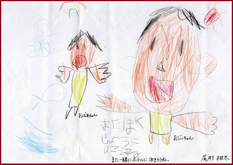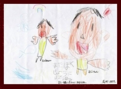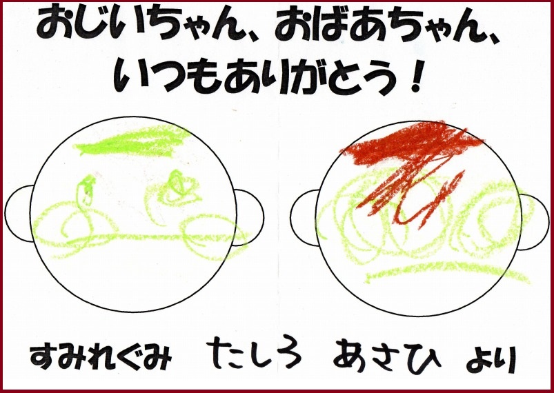 「敬老の日」のプレゼントとして上海に住む柑太から、そしてバンコクに住む朝大から | おじいちゃんとおばあちゃんを描いた絵が送られてきた。 離れて暮らす祖父と祖母に孫が描いた絵を、送ると云う幼稚園が考えてくれた恒例のイベントだ。 幼稚園からの手紙も同封されていた。 上海は→ここ バンコクは→ここ