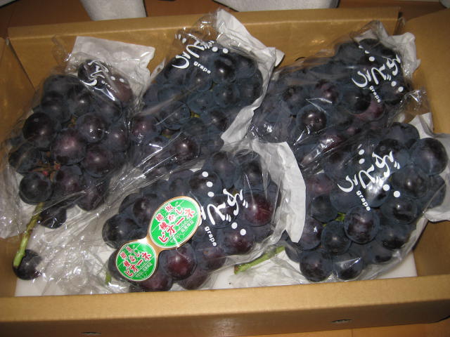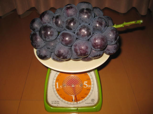 送っていただいた梨を食べ終えた数日後、 友達のお兄さんの果樹園から,注文しておいた山梨のぶどうが届いた。 宇都宮のスーパーでは、中々売っていない高級品のぶどうだ。 高齢になったお兄さん夫婦が、いつまで続けられるかと心配だったが、 友達に電話をしてみると、今年も大丈夫との事だった。 早速、3軒への配送をお願いした。 今年は、特大サイズのぶどうが入っていた。 1房がほぼ1kgもある。びっくり〜 5房の合計で4kgになる。 800gの重さが一番多かった。 小樽に住む姉と妹にも配送を頼んでいたので、2人からお礼の電話があった。 とても喜んでもらえるので、送りがいもあるし、とっても嬉しい〜