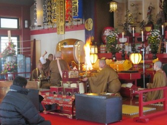有佳里がお腹にいる臨月の時、美映が、この階段を登ったが、今は迂回路が作られている。 | もしかして、誰かが階段から転げ落ちたのかな〜と想像した。 お正月にお酒を飲んでいる人も多いから。。 貞治、美映、我が家の護摩炊きの申し込みを、お金(5000円x3)を添えてお願いした。 それとは別に我が家用の交通安全のお守りの護摩焚きの3000円も。。 10時きっかりにお坊さん5人がお堂に入ってきた。 経木を燃やしながら、太鼓をたたいてお経が始まった。 ビデオは→ ここ 迫力ある太鼓とお経が、お腹と胸に響いて、ご利益がありそうと有難い気持ちになった。