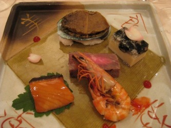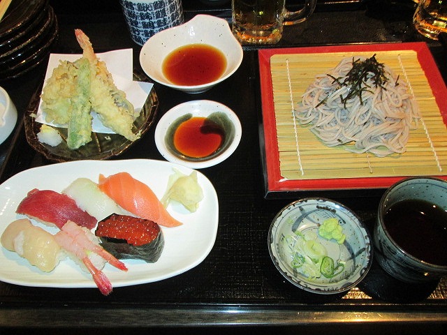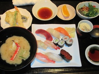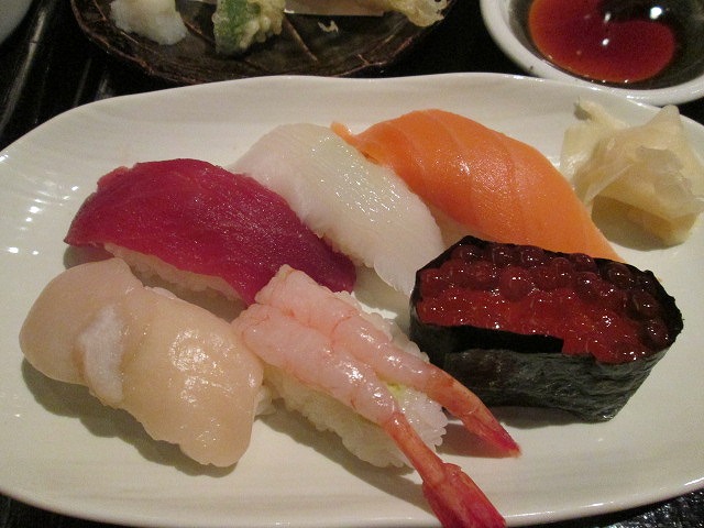 やはり、小樽のお寿司は美味しいな〜 | まぐろ、イカ、サーモン、帆立、甘海老、イクラ。 どれも美味しかった。 天ぷらも大きな海老が付いていて、大満足だった。