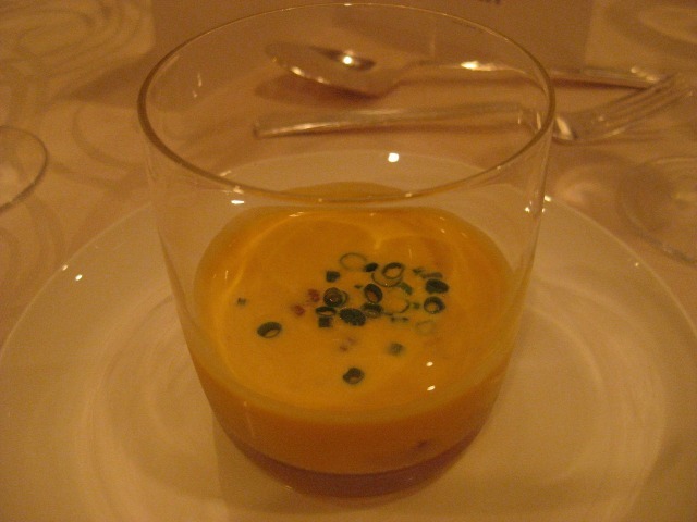 南瓜とコンソメジュレのマリアージュ たらば蟹と平目のパートフィロの包み焼き