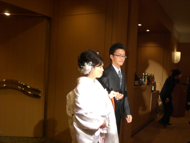 お色直しのために、披露宴会場より、甥の中学3年生の純くんに手を引かれて退場。 | このシーンも始めて見た。 背広姿の純くんが新郎に見える〜と、皆で大笑いした。 ホテルのウエディングプランナーのアイディアなのかも。。