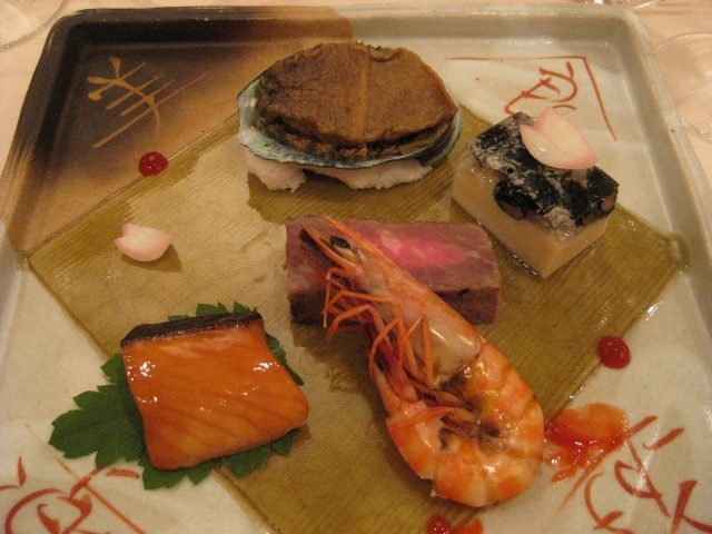 鮑祝い煮 車海老芝煮 旬魚照り焼き 牛西京漬け お造り3種盛り(まぐろ、はまち、海老)