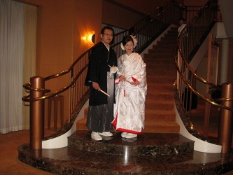 しばらくすると、着つけが終わった花婿、花嫁さんが親族の控室に現れた。 | みんなで拍手をした。 「きれい〜」と、みんなが声をあげた。 次女の花嫁姿を見た姉が泣きだした。 花嫁も泣いた。 私たちももらい泣き。。 親族の写真撮影をしますとの知らせで、控室を出た。 背景にぴったりの階段のところで2人の素敵な写真を。。 みんながパチリ!! その後、親族の記念撮影と親族の紹介が終わって、いよいよ披露宴会場へ。。