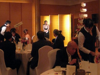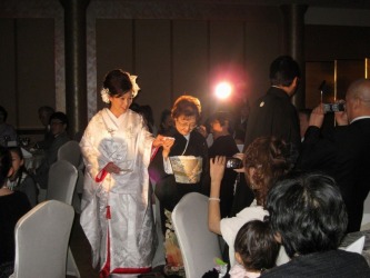 花婿登場、その後に続き、花嫁が母親に手をひかれて登場。 始めて見たシーン。 | 乾杯!の音頭、来賓の挨拶、友達の挨拶が続く。 その中で心打たれた花嫁の友人の挨拶。 転校して始めて声をかけてくれたのが、新婦の扶三ちゃん。 その後、ず〜と親友に。。いろいろとエピソードを交え、話しが続く。 いろいろな事があった思い出話しを。おもわず、涙で話しが出来なくなる。 「頑張って〜!」と、会場から声がかかる。 こんなに心のこもった友人のスピーチは、聞いたことがないと思う程、感動的だった。