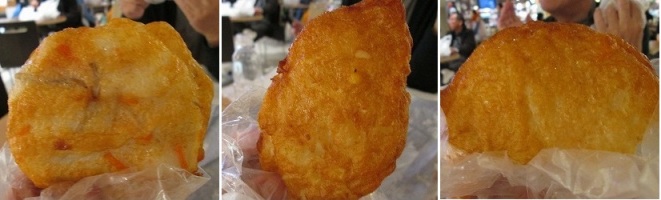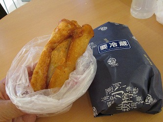 千歳空港で、楽しみなのは、小樽「かま栄」の揚げかまぼこの「パンロール」を食べる事。 | お店の前には、かなりのお客さんがいた。 「パンロール」2個と「まる海老天」ほか3枚、全部で5枚を買った。 「パンロール」は、揚げたてが、美味しいので、すぐに千歳空港で食べた。 すりみをパンで包んだ揚げかまぼこなのだが、冷めたら美味しさが半減なのだ。