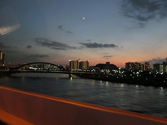羽田に着いてから、3日間、車を預けた駐車場へ。。そして宇都宮に向け出発。 | これから暮れかかる隅田川と周辺の少し夕焼けの景色がきれいだった。 隅田川とビル街。 隅田川と橋。 スカイツリーもパチリ!→ ここ ぼけているけど。。 今回の小樽行きは、3日間と短かったが、扶三ちゃんの結婚披露宴に出席し、 幸せそうな2人を見て、本当に嬉しい旅となった。 末長くお幸せにね。 |