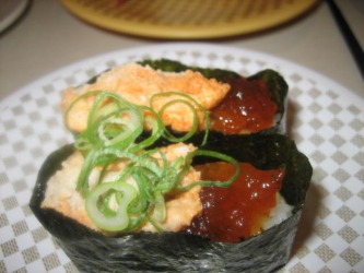 私が頼んだアン肝軍艦と海老の天ぷらの巻き寿司風。 | あん肝軍艦は、こくのある大人向きのお寿司かも。。 海老の天ぷらの巻き寿司は、外側に海苔の変わりに胡麻が。。 それが、味のアクセントになって、思いのほか、美味しかった。